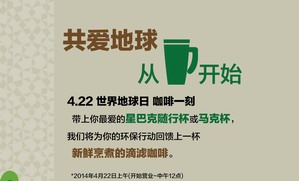 4月22日“地球日”,星巴克邀請你一起共愛地球。2014年4月22日,從上午9點到中午12點,星巴克與您共享咖啡一刻。在全國的各個門店,星巴克為所有自帶星巴克隨...