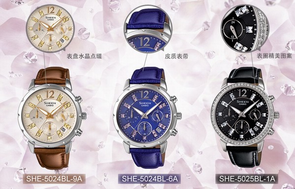 同樣采用施華洛世奇水晶制作表把的MULTI HAND系列,在外型上更輕松和調(diào)皮。最為突出的是用色非常大膽,其中SHE-5024BL-6/9A以藍(lán)紫、淡棕為主調(diào),SHE-5025BL-1A則主唱黑色。SHE-5024BL-6/9A表款采用“花形”表圈,表盤內(nèi)時間刻度采用水晶點綴,搭配三個小表盤,特顯雍容華貴。SHE-5025BL-1A則在表圈雕出細(xì)致精美的圖案,與表盤的精簡設(shè)計形成恰到好處的對比,張弛有度。三只表款均采用皮質(zhì)表帶,讓佩戴舒適感大大提高。(http://www.casio.com.cn/wat/index.html