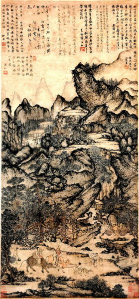 《稚川移居圖》是今年保利春拍的壓軸重器,描述東晉時期,煉丹家葛洪移居羅浮山煉丹的故事。這幅畫已經流傳600多年,但畫面依然清晰,最上方是密密麻麻的題跋和印章,畫面正中,山巒疊著山巒,怪石林立。葛洪一行5人,走在最前方的兩人牽著牛繩,中間的兩位分別端坐在牛背上,寬袍大袖,最后面的一位步行,緊緊跟著,他們在崇山峻嶺中穿行。
