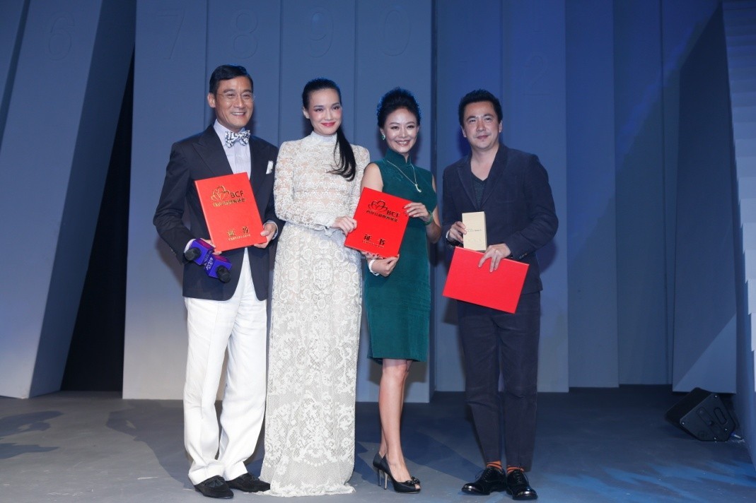 舒淇、梁家輝、王中磊先生與東宮珠寶品牌創(chuàng)始人兼董事長丁戟女士合影