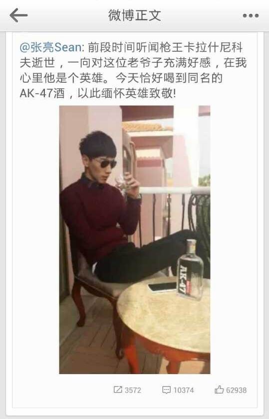 微博中的“AK-47酒”作為爭論的源頭成為了事件的焦點之一。據(jù)悉在此之前,因為“槍王”卡拉什尼科夫的去世,其創(chuàng)造的AK-47步槍及AK-47文化再次成為世界各大主流媒體的焦點。其中,圍繞著AK-47步槍的歷史淵源和文化延伸,1月8日出版的國內(nèi)知名新聞雜志《VISTA看天下》大篇幅策劃了“AK-47一支槍的世界觀”專題,該專題造成較大社會輿論反響,同時專題中重點圖釋了AK-47伏特加酒,并加以介紹。近期集中、多方面的報道引起一輪AK-47伏特加熱,軍迷以AK-47伏特加悼槍王成為網(wǎng)絡熱議的話題。目前,AK-47伏特加與步槍都已成為AK-47文化符號標志而廣為傳播。有網(wǎng)友因此猜測,張亮以酒悼英雄的微博創(chuàng)意也源出于此,而“男神”也無疑是一名血性軍事迷。