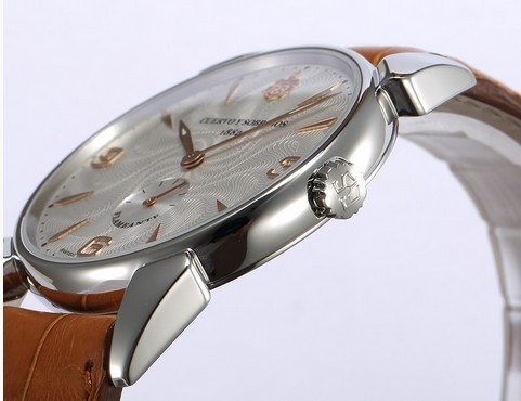 40毫米尺徑相對(duì)于僅有7毫米厚度的機(jī)械表款來(lái)說(shuō)已經(jīng)足夠大了,如果你還介意有點(diǎn)小?瑞士庫(kù)爾沃(Cuervo y Sobrinos)專(zhuān)有的甲蟲(chóng)角表耳設(shè)計(jì)風(fēng)格,將表殼與表帶的弧度向外撐起。在保證超薄表殼舒適貼腕的同時(shí),甲蟲(chóng)角表耳又微微向內(nèi)拱,在外觀(guān)上看起來(lái),如果主人是粗腕,這種足夠長(zhǎng)的表耳可以撐起表帶顯得表殼夠大;如果是瘦小的也不必?fù)?dān)心,表耳的內(nèi)拱弧度加上表帶的柔韌性也剛剛合適,畢竟尺徑的參數(shù)是一定的,這種巧妙的設(shè)計(jì)只是在視覺(jué)上玩了個(gè)“把戲”。一枚好表,總不可能采用大表殼小機(jī)芯吧?