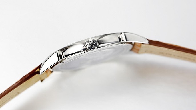 表殼采用鬧鈴式微弧拋光精鋼,整體線(xiàn)條圓潤(rùn)柔和沒(méi)有絲毫浮夸感;平角表冠在設(shè)計(jì)上中規(guī)中矩但深槽紋卻大有文章,作為一款手動(dòng)腕表,這也是這款表最低調(diào)卻最主要的地方,當(dāng)然在設(shè)計(jì)上也是盡以功能主義為主。平把增厚是防止在日常生活中的應(yīng)外力,為了方便日常的上鏈效果,實(shí)用的深槽紋冠頭與表殼之間也是非常合密。316L精鋼表殼采用表面光潔度13級(jí)即Ra 0.025微米的精細(xì)打磨,可堪比金屬鍍層的鏡面光度。瑞士庫(kù)爾沃(Cuervo y Sobrinos)所生產(chǎn)的每一塊表都有獨(dú)立的編碼,而每一個(gè)編碼都有自己的銷(xiāo)售區(qū)域。表殼背面沿邊刻有防水指數(shù)、系列名稱(chēng)、及所在銷(xiāo)售區(qū)域的編碼,這也證明了一個(gè)優(yōu)秀品牌對(duì)其產(chǎn)品的嚴(yán)謹(jǐn)與負(fù)責(zé),售后永遠(yuǎn)是放在第一位的。
