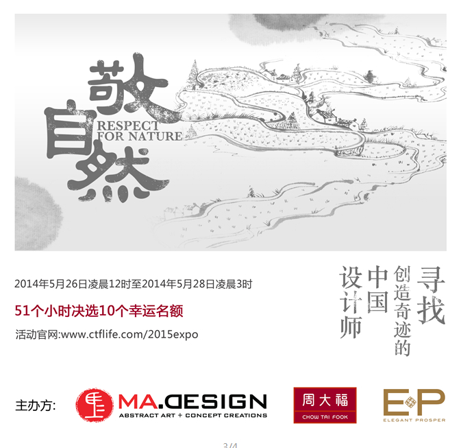 2014年5月26日凌晨12時至2014年5月28日凌晨3時,51個小時決選10個幸運(yùn)名額,周大?!癛espect For Nature敬?自然”設(shè)計大賽,夢寐以求的學(xué)習(xí)經(jīng)歷,非凡的創(chuàng)作過程。尋找創(chuàng)造奇跡的中國設(shè)計師,是你嗎?