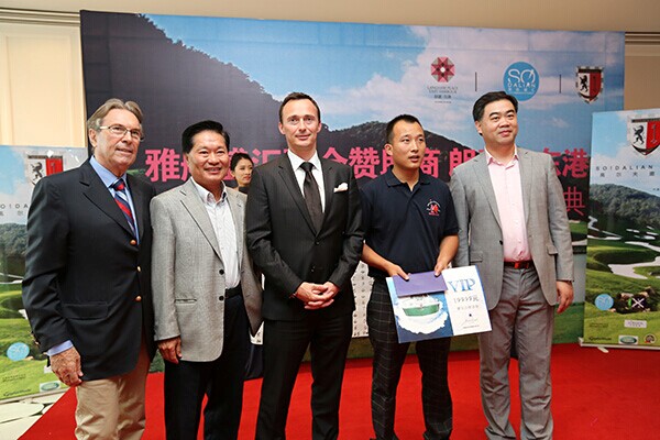 Legacy Club STA董事長兼創(chuàng)始人Alain Sarfatti(左一),大連西郊高爾夫俱樂部董事長Kevin Wong(左二), 大連香格里拉酒店總經(jīng)理Dorian Rommel(左三), 大連朗豪房地產(chǎn)的副總 Mr Xia(右一)與冠軍獲得者合影