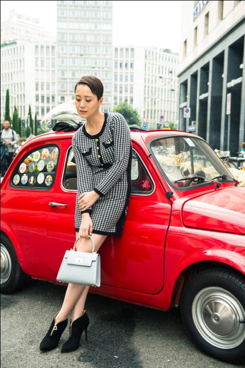 海清復(fù)古千鳥格羊絨連身裙撞色紅色古董車,頓現(xiàn)含蓄的奢華