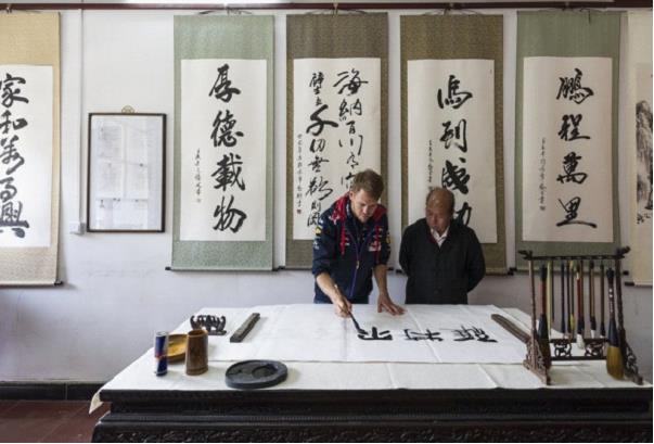 在維特爾眼中,“北京有著更多古老中國的味道?!?nbsp;2014年,奧地利Red Bull車手維特爾在F1中國賽后抵達北京,特別向中國書法美術(shù)家協(xié)會,國際書畫藝術(shù)協(xié)會資深書法家韓伯云先生拜師學(xué)藝。