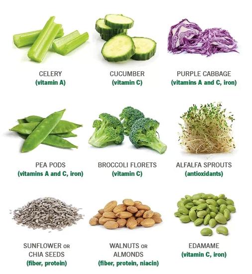芹菜、黃瓜、紫甘藍(lán)、扁豆、西蘭花、豆芽、葵花籽、杏仁、毛豆