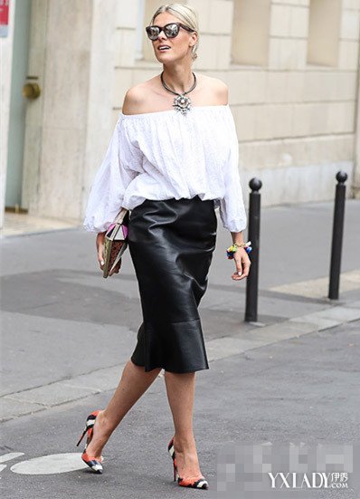 搭配示范:一字領(lǐng)白色上衣+皮質(zhì)包臀中裙+蛇紋高跟鞋+盒子造型handbag