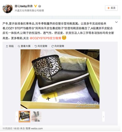 2010年COZY STEPS正式進入中國市場,在不斷創(chuàng)造銷量奇跡的同時更滿足了內(nèi)地消費者對優(yōu)質(zhì)雪地靴的消費需求,為國內(nèi)雪地靴行業(yè)注入了新的活力。未來COZY STEPS將繼續(xù)以優(yōu)質(zhì)的產(chǎn)品和極富創(chuàng)意的設(shè)計理念來服務(wù)廣大消費者,讓更多人領(lǐng)略到頂級雪地靴所帶來的美好穿著體驗。