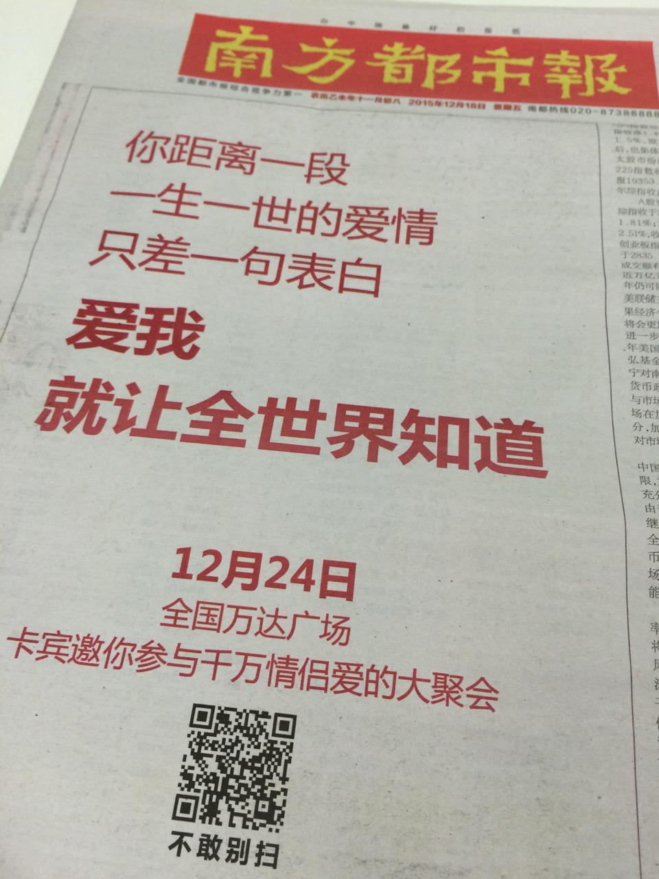 看完,著實(shí)有種“要脫光、就表白”的沖動(dòng)。掃一掃報(bào)紙廣告上的二維碼,原來(lái)是最具時(shí)尚號(hào)召力的中國(guó)服裝設(shè)計(jì)師品牌Cabbeen聯(lián)手中國(guó)商業(yè)地產(chǎn)奇跡——萬(wàn)達(dá)廣場(chǎng)合作舉辦的第二屆“萬(wàn)達(dá)·卡賓·愛(ài)表白”活動(dòng)在做表白提醒。