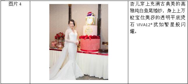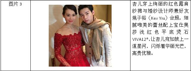 (2015年12月28日)「香港十大杰出設(shè)計(jì)師」姚子裕(Kev Yiu)掌舵的Kevolie與來(lái)自捷克的全球知名仿水晶產(chǎn)品制造商寶仕奧莎(Preciosa)旗下水晶配件業(yè)務(wù)首度合作,為知名影星胡杏兒量身打造一紅一白的完美嫁衣。在她生命中的重要時(shí)刻,寶仕奧莎以其閃耀璀璨的產(chǎn)品為其獻(xiàn)上最真摯華麗的祝福。