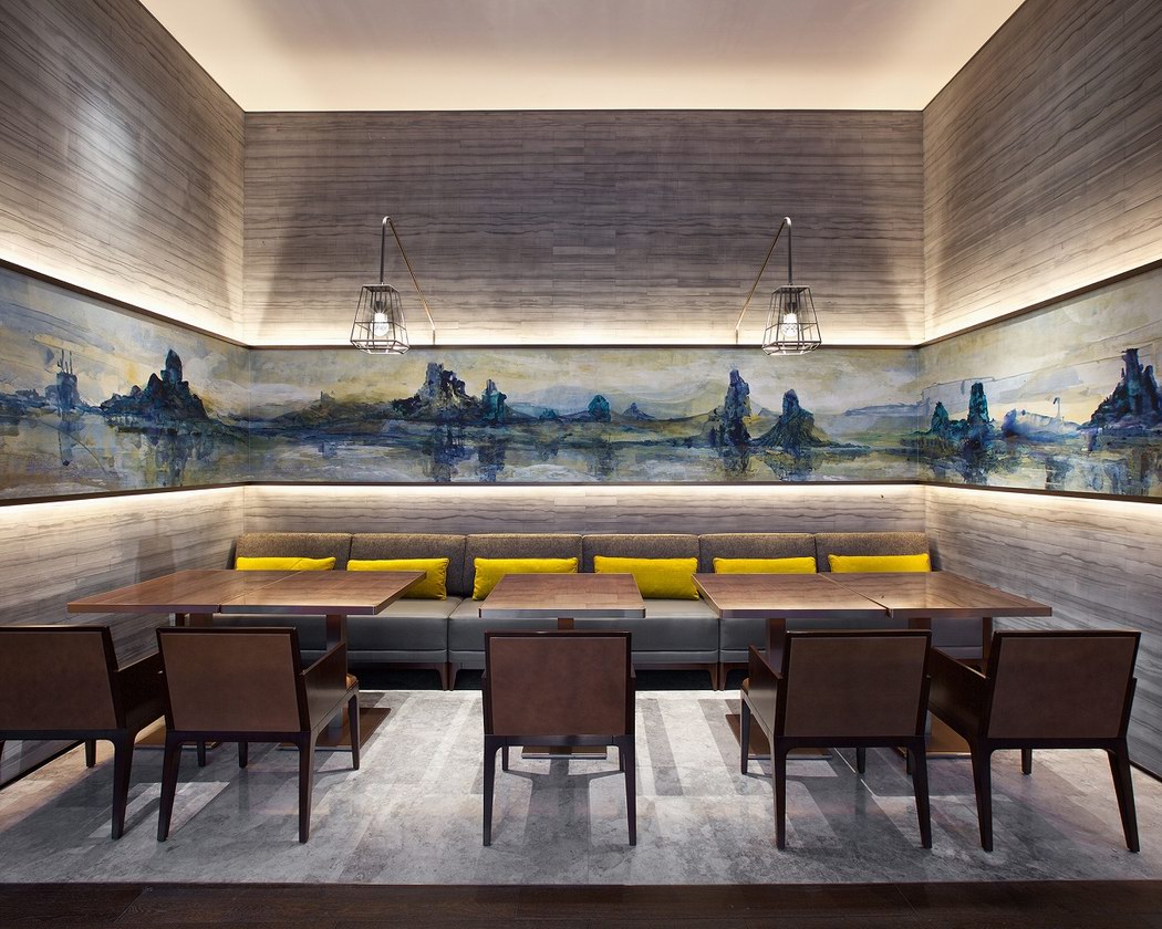 秉承這一宗旨,Canvas委托湖北籍藝術(shù)家曾梵志創(chuàng)作巨幅油畫《抽象風景》,其鮮艷的色調(diào)與曲折的線條令人聯(lián)想到超脫塵世、不受時間影響的永恒風景,與北京諾金酒店身處的喧囂都市形成鮮明對比。在明代達到鼎盛的瓷器長久以來幾乎是中國工藝的代名詞,通過Wu San Bao精心手繪的兩只碩大花瓶,這一藝術(shù)載體獲得重新演繹,在酒店大堂兩側(cè)以令人驚嘆的方式迎接著酒店客人。而出自帕斯卡爾· 馬爾蒂那· 塔尤之手的兩座標志性“圖騰”—一直堆到天花板的青花瓷花瓶構(gòu)成了兩根貌似搖搖欲墜的柱子。