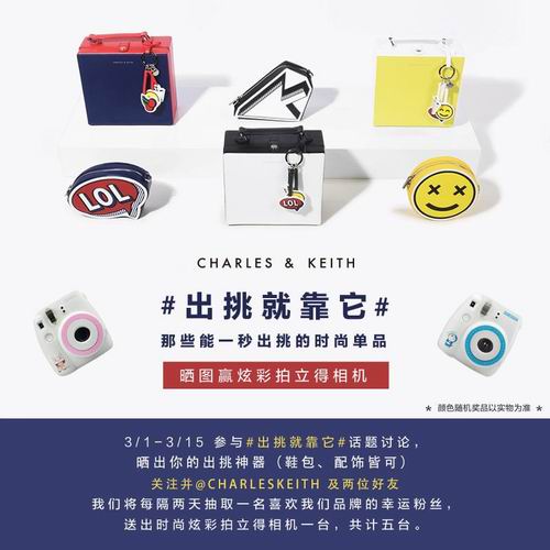 如果你覺得這樣還不夠,那么就請立即關(guān)注Charles & Keith官方微博,在天貓下單成功的各位女王可以在狂歡期間( 3月1日-15日),搜索微博#出挑就靠它#話題,參與官方微博話題#出挑就靠它#來曬單,秀出你買到的單品,將有機(jī)會贏取炫色拍立得(每隔兩天抽取一名幸運(yùn)網(wǎng)友獲獎(jiǎng))。 手快有!手慢無!