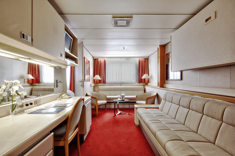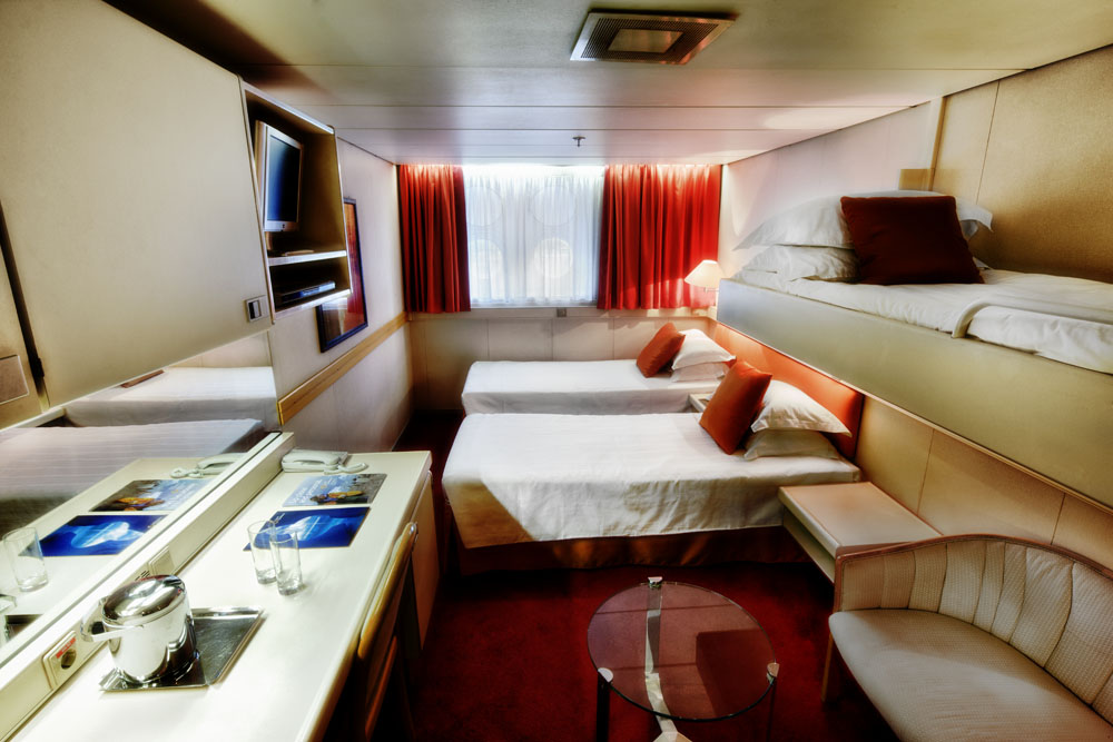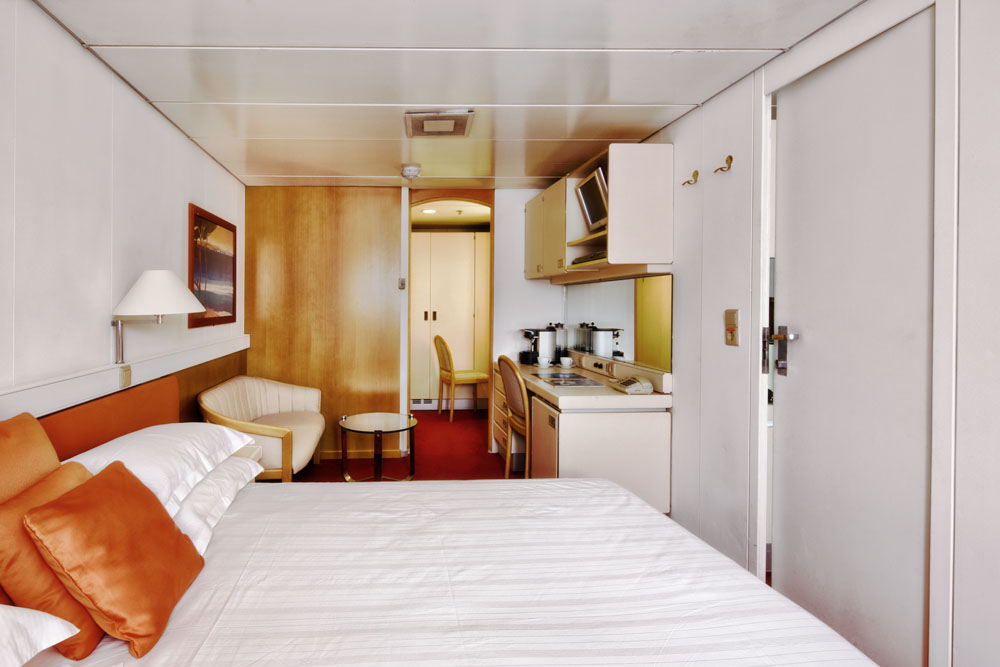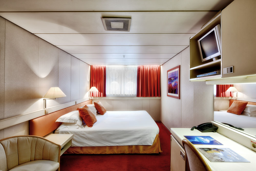 客艙有兩張單人床或合并成一張大床,兩個(gè)衣櫥、兩個(gè)帶鎖的抽屜,一臺(tái)平板液晶電視機(jī)和DVD機(jī)、吹風(fēng)機(jī)、兩件浴袍、可個(gè)別調(diào)節(jié)的空調(diào)和加熱器,220V電壓的電源插座。