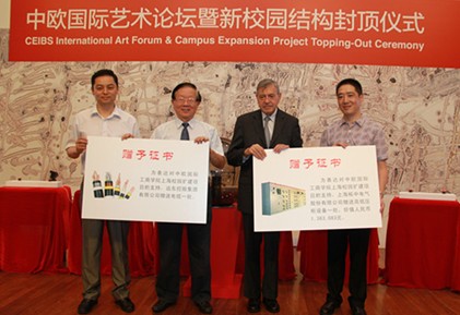 隨后,在張維炯副院長邀請下,15位中外嘉賓來到臺上,共同按下啟動中歐新校園結(jié)構(gòu)封頂儀式的按鈕,大屏幕上展現(xiàn)出工地現(xiàn)場吊車將適才嘉賓們鏟入吊桶的混凝土倒入新校園主樓樓頂?shù)膶崨r。至此,中歐新校園結(jié)構(gòu)正式宣告封頂。在盛大的結(jié)構(gòu)封頂儀式結(jié)束后,“2012相約上?!敝袣W藝術(shù)論壇正式開始。