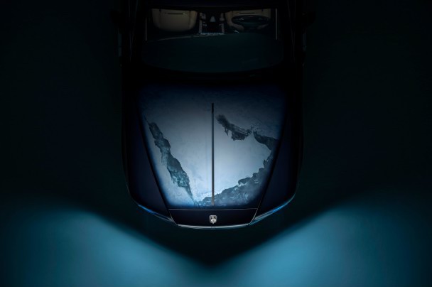 魅影Bespoke高級定制車型“蔚藍(lán)星球”的靈感來源于星際間的太陽系和人類棲居的地球?;始宜{(lán)(Royal Blue)的車身顏色象征著地球表面75%被水覆蓋,引擎蓋上則是一幅以阿聯(lián)酋為中心的中東地區(qū)衛(wèi)星圖。手工涂裝的翡翠綠(Emerald Green)車身裝飾線則將太陽和星系中的八大行星相串聯(lián)。