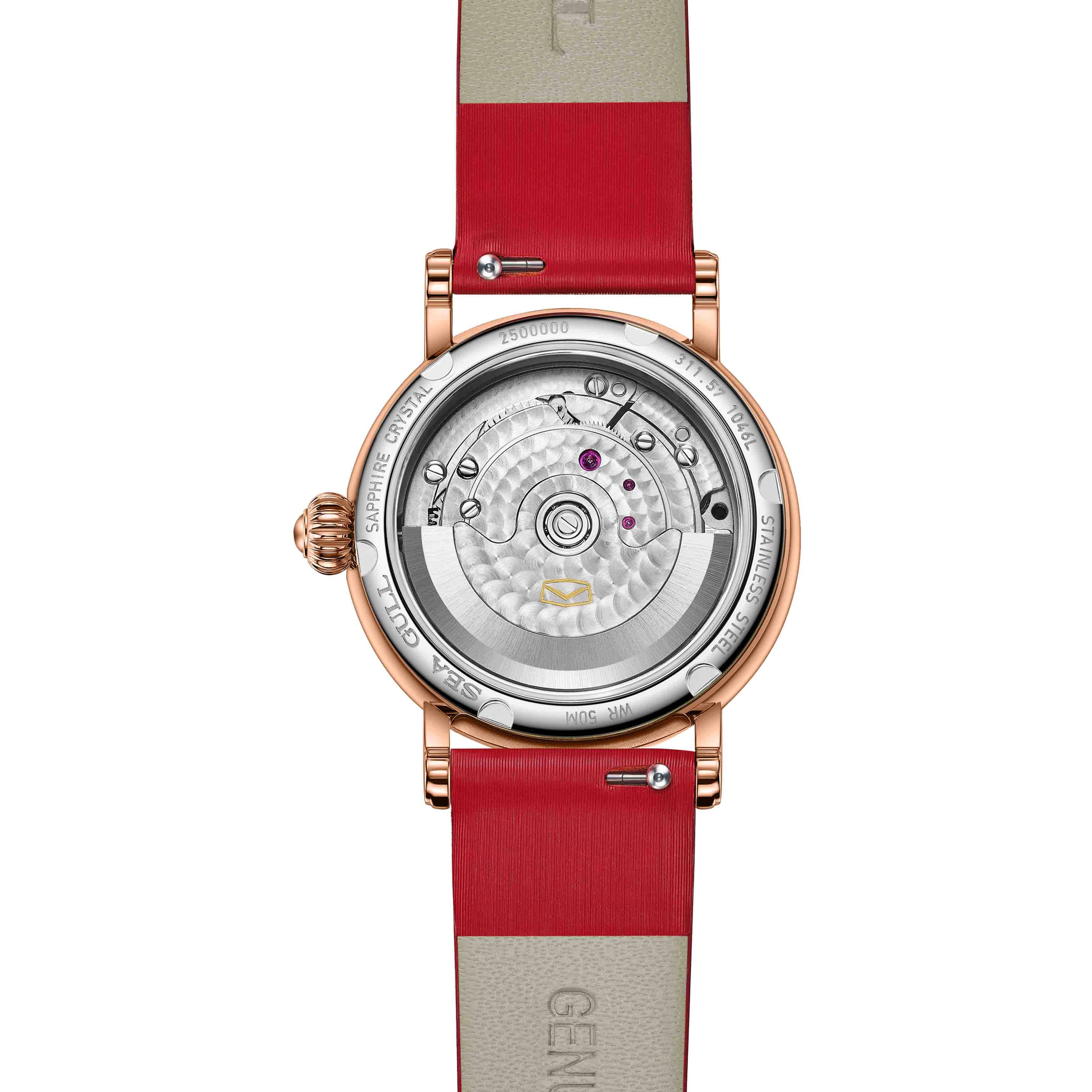表背的透底設計可見海鷗自研ST4200機芯跳動的靈動美感,這枚國表尺寸最小的機械腕表機芯,于溫婉的腕表中增添一份細膩的力量。機芯以28800次/小時的振頻,蘊藏穩(wěn)定而澎湃的能量。