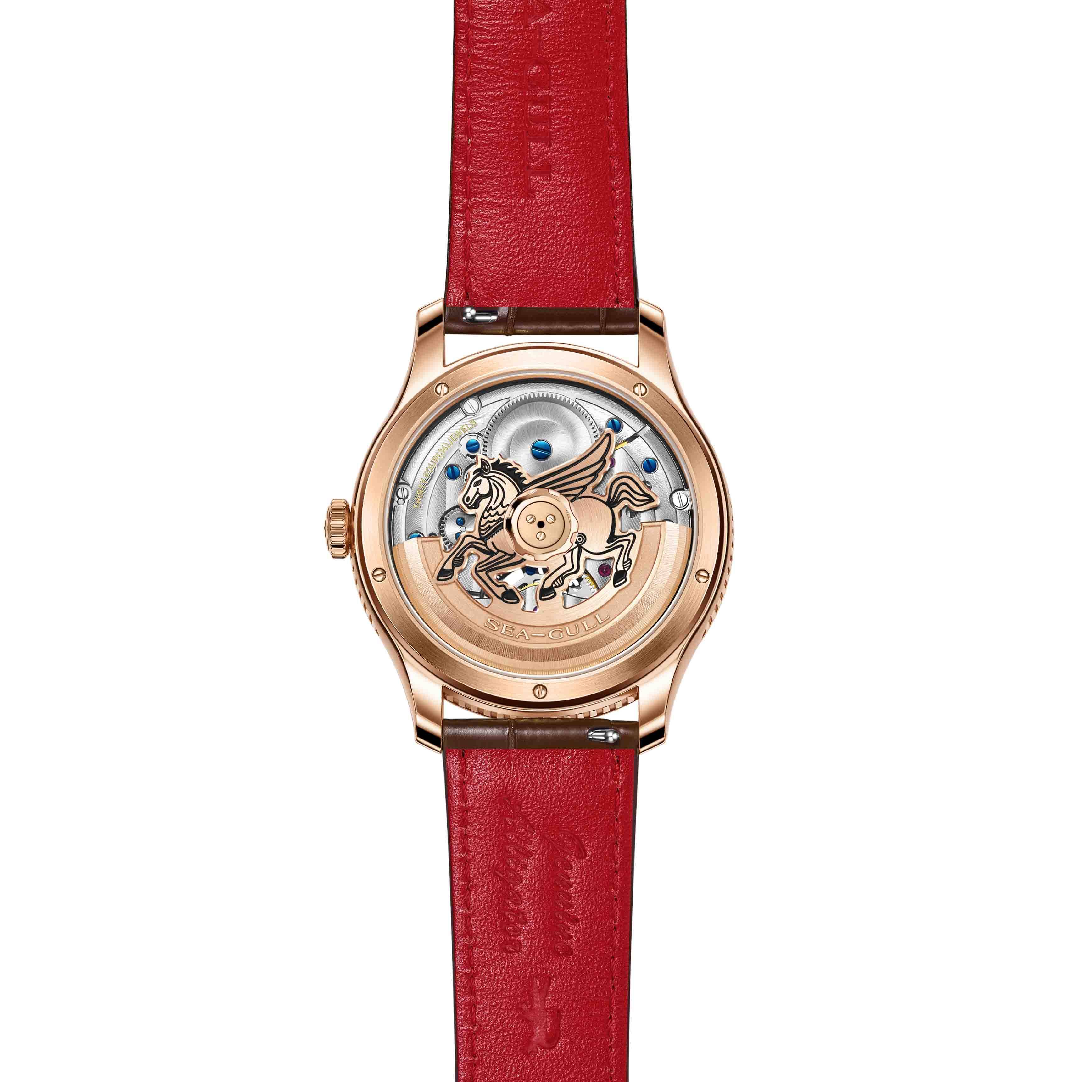 表盤的靜為琴音遇伯樂,表背面的動為翼馬騰飛,動靜相結(jié)合輕吟春日弦歌。腕表搭載海鷗自研的ST8610機芯,以4.3毫米的極限超薄厚度,平衡“輕薄”與“性能”。機芯以“三點一線”布局,將發(fā)條盒、自動陀與陀飛輪沿縱向軸線依次排列,如書法中“橫平豎直”的筆意,玫瑰金色翼馬在機芯擺陀之上馳騁軌跡,與陀飛輪的持續(xù)旋轉(zhuǎn)形成一幅靈動之景。