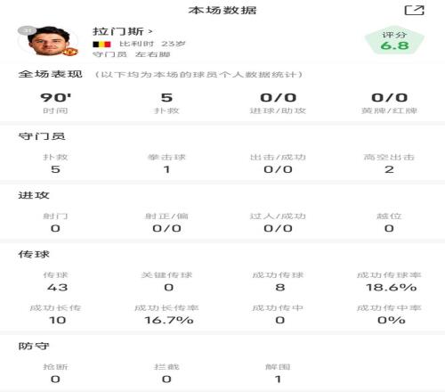 拉門斯戰(zhàn)利物浦全場(chǎng)數(shù)據(jù):貢獻(xiàn)5次撲救助曼聯(lián)客場(chǎng)取勝