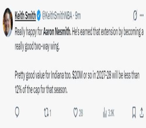 肯尼-史密斯表示:真的為內史密斯感到感謝,他值得這筆續約合同,對于步行者來說這次續約也極具性價比,27-28賽季大約2000萬連該賽季工資帽的12%都不到。