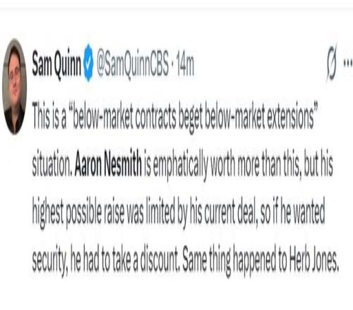 CBS記者薩姆-奎因評價內史密斯這筆續約:這種明顯低于市場價的續約情況,阿龍-內史密斯的價值遠遠高于他跟步行者簽下的兩年4040萬,但根據他現有的合同條款,他所能獲得最大的加薪限度是有限的(低于工資帽12%),所以要保障自己的利益就只能接受一定的折扣。鵜鶘的赫伯特-瓊斯也是類似的情況。