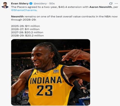 埃文-斯迪瑞也曬出了內史密斯的合同細節:25-26賽季1100萬、26-27賽季1100萬、27-28賽季2020萬、28-29賽季2020萬,他未來四年的薪水僅為6240萬,均薪為1560萬,對于這樣的頂級3D來說步行者贏麻了。