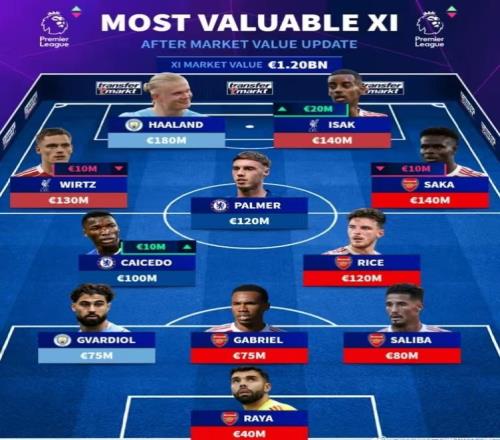 德轉(zhuǎn)列身價(jià)更新后英超最貴陣:哈蘭德領(lǐng)銜,總身價(jià)達(dá)12億歐